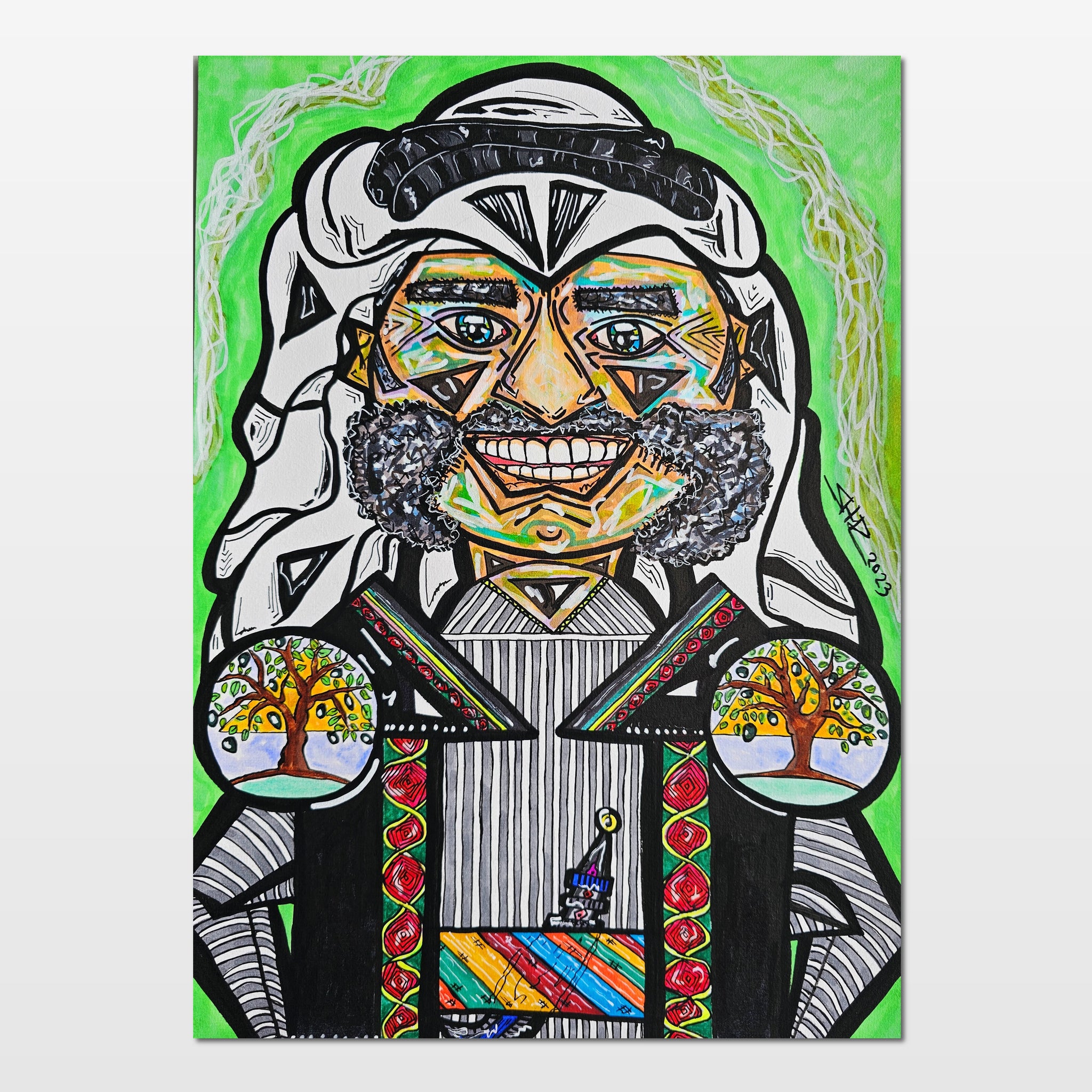 In this painting, you see a farmer depicted in an abstract, yet recognizable style, symbolizing his deep connection to his land. He's dressed in sturdy, and traditional clothing that represents his heritage, including what is called a "shemagh".