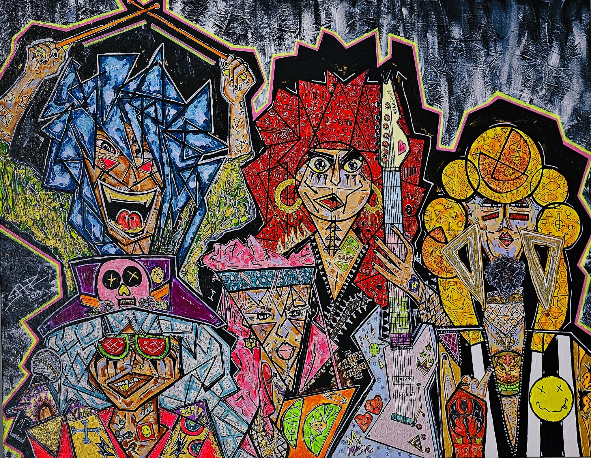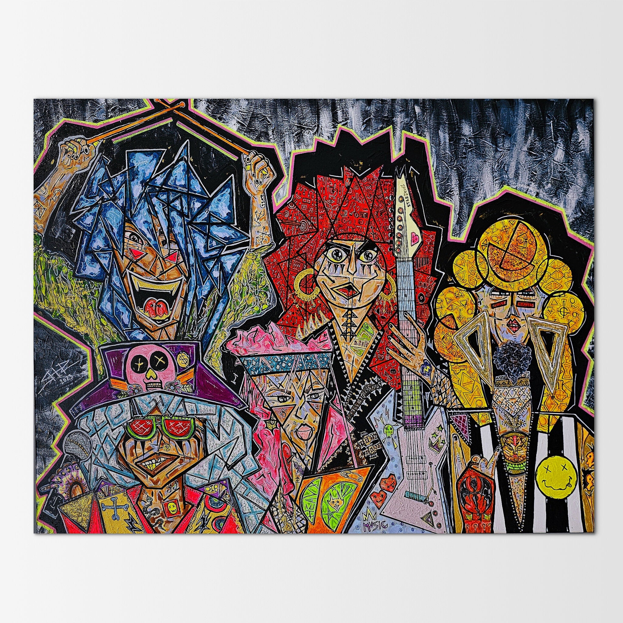 Thresher, the vocalist, stands to the far left, embodying the spirit of a rock legends. His iconic red glasses, frame his face as he looks into the distance, showcasing a sense of wild abandon and raw emotion. Thresher's persona, both on and off the stage, is larger than life, and his presence in the painting is electrifying.