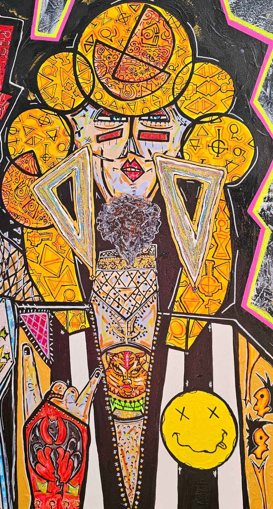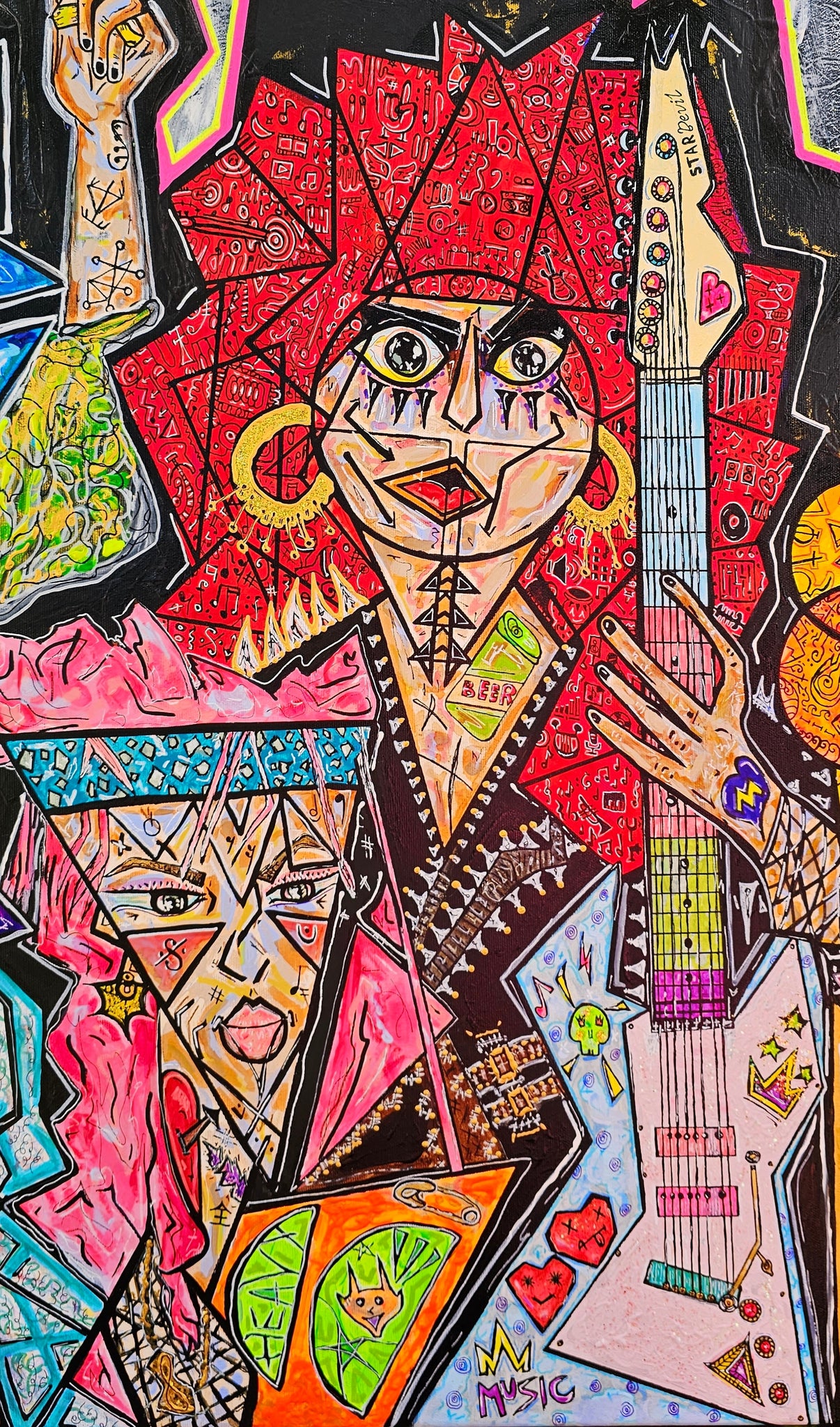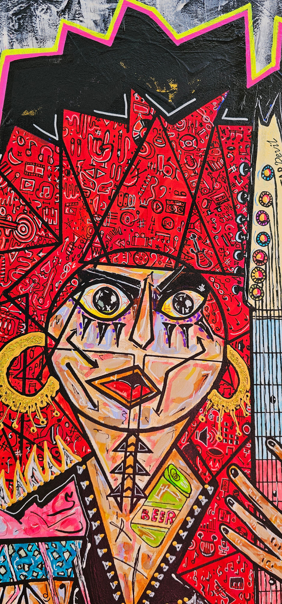 Bull, the bassist, stands at right side of the painting. His serious demeanor is a stark contrast to the wild energy of the others. His blonde, golden hair shines under the stage lights, and his gigantic triangular earrings glint menacingly. Bull's greyish goatee adds to his rugged, no-nonsense appearance, emphasizing his role as the steady, grounding force of the band.