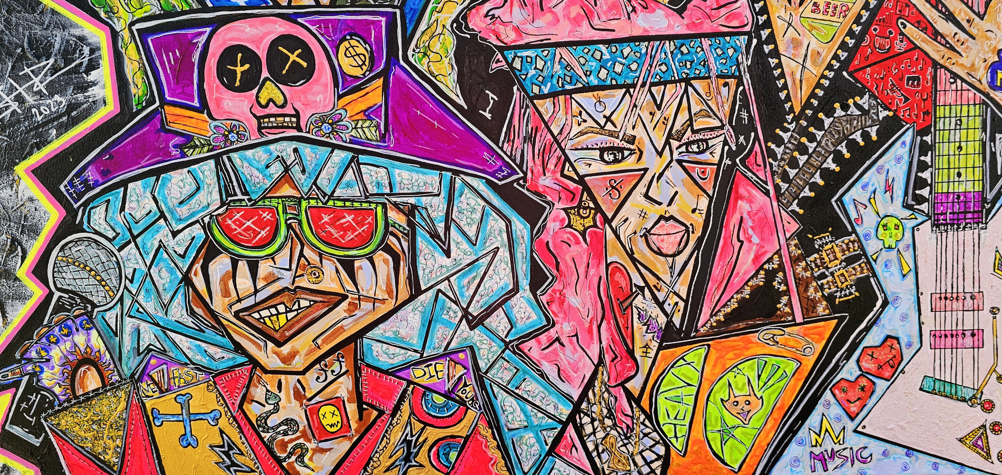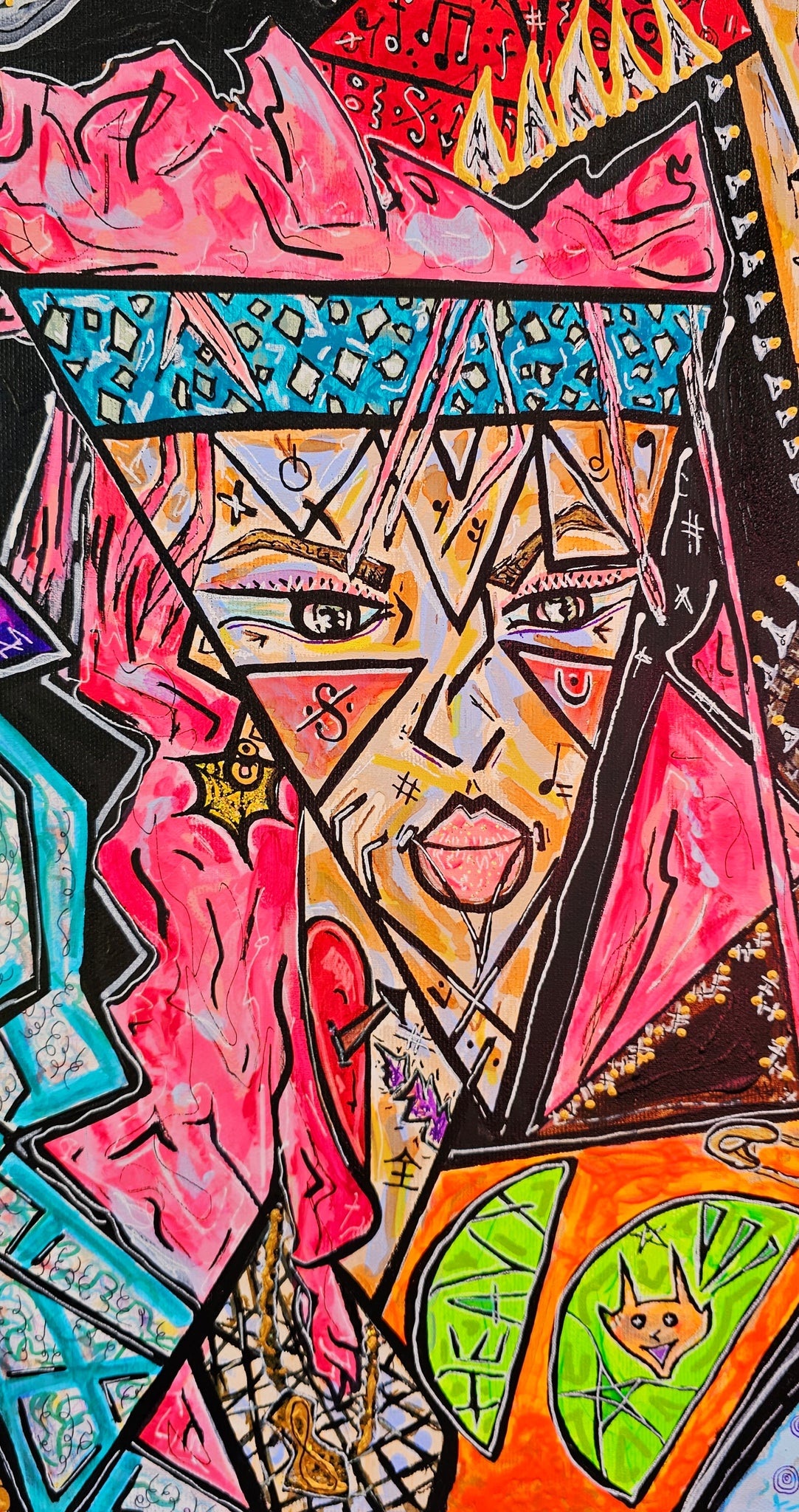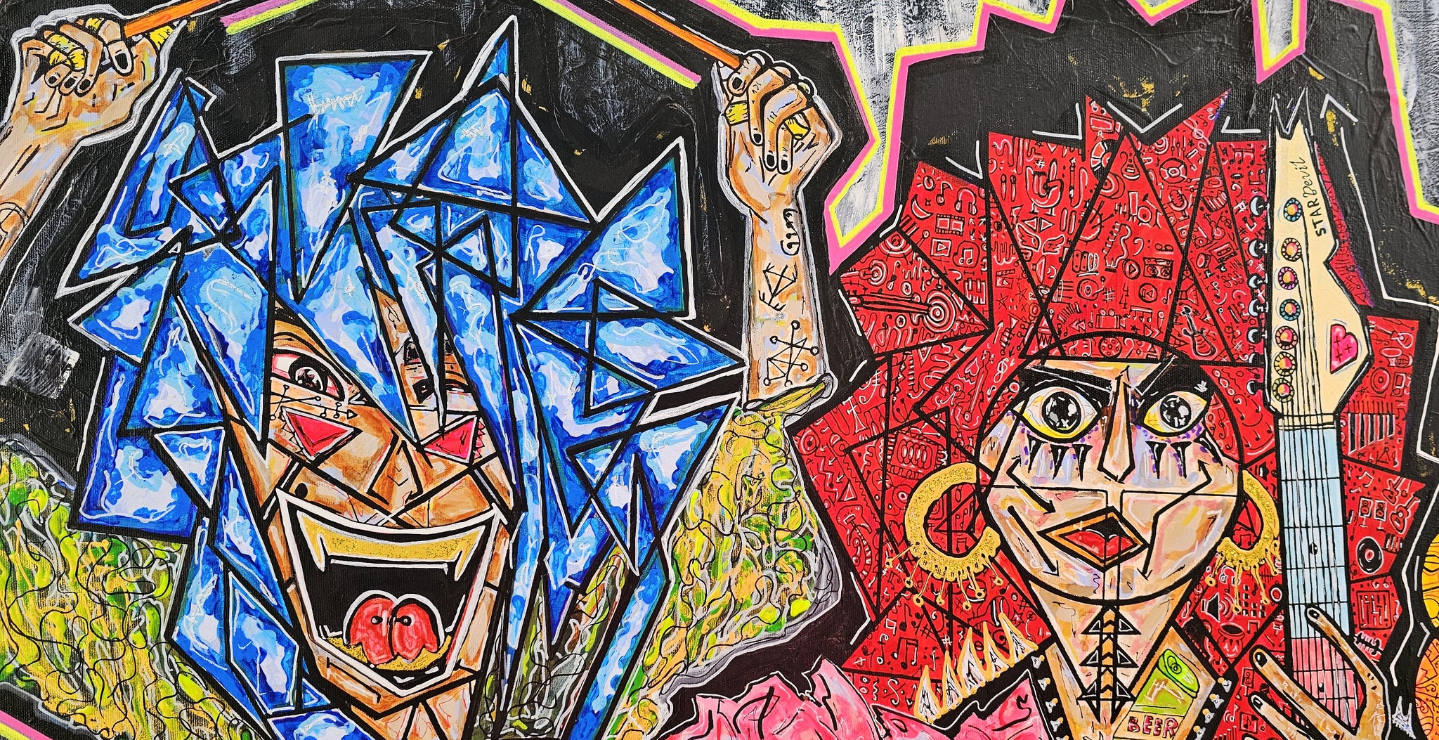 Bull, the bassist, stands at right side of the painting. His serious demeanor is a stark contrast to the wild energy of the others. His blonde, golden hair shines under the stage lights, and his gigantic triangular earrings glint menacingly. Bull's greyish goatee adds to his rugged, no-nonsense appearance, emphasizing his role as the steady, grounding force of the band.