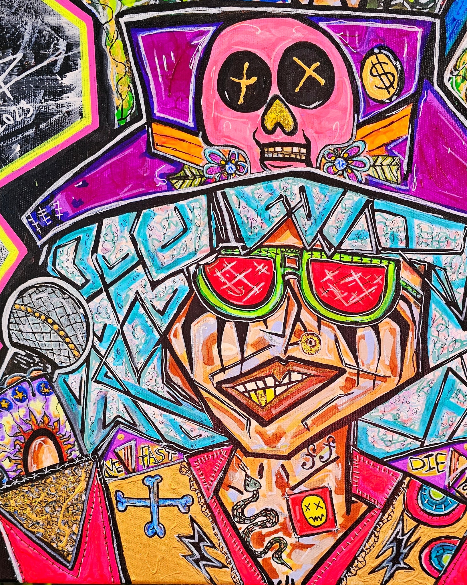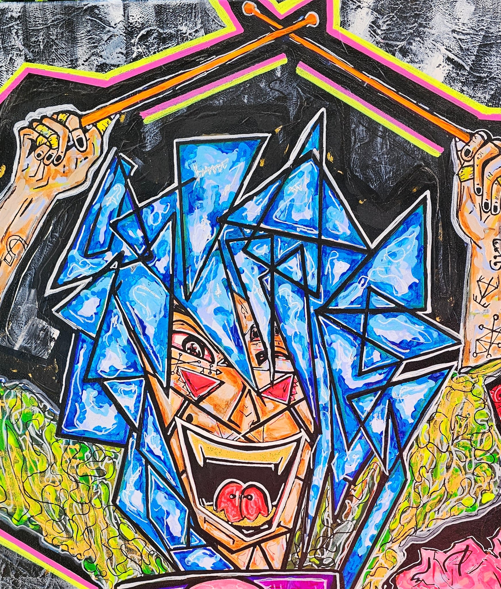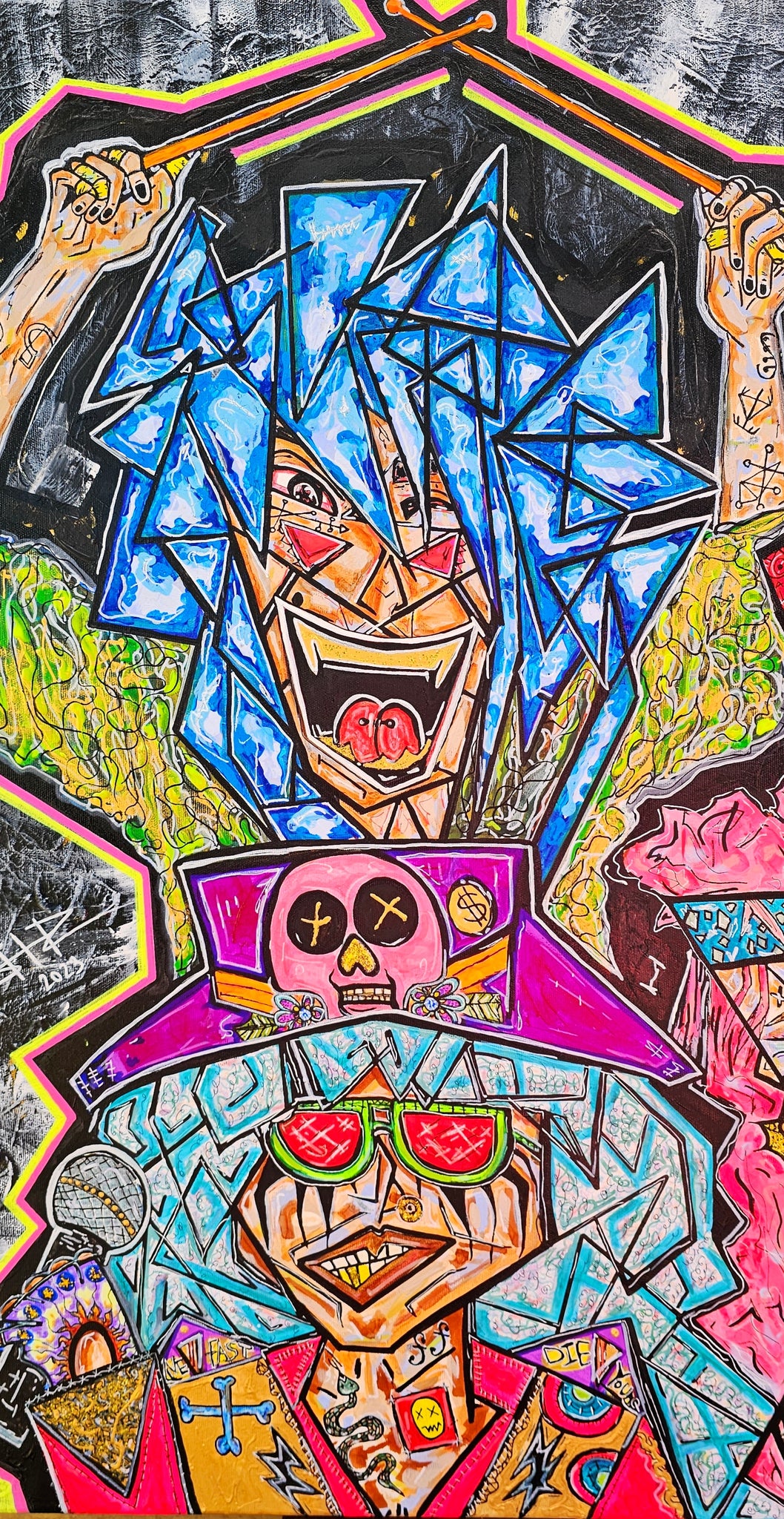 Tiger, the drummer, is positioned behind the front line but is no less prominent. With his blue hair and sadistic laugh, he raises his drumsticks high in the air, as if ready to unleash a thunderous beat. His infectious, almost maniacal energy radiates from the painting, giving a glimpse into the chaotic power that drives the band's rhythm.