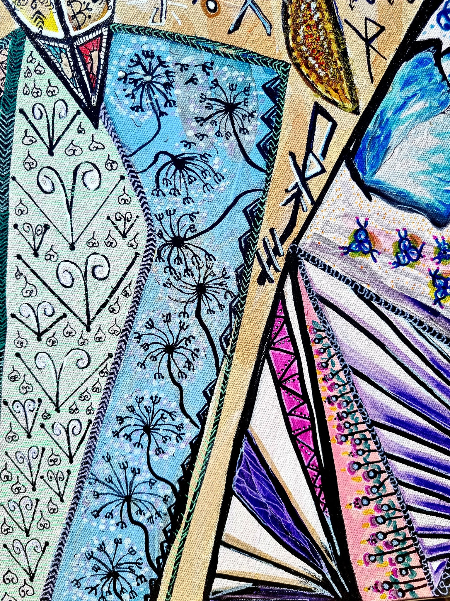 The depiction of the three sisters, uses detailed and precise strokes to distinguish their individual traits, while their similar shapes and posture highlight their unity. Their eyes hold an enigmatic gaze, suggestive of the mysteries and secrets they hold within, a testament to their sorcerous powers.