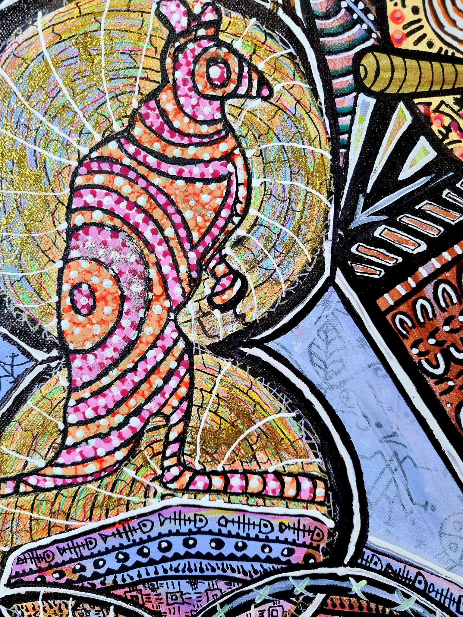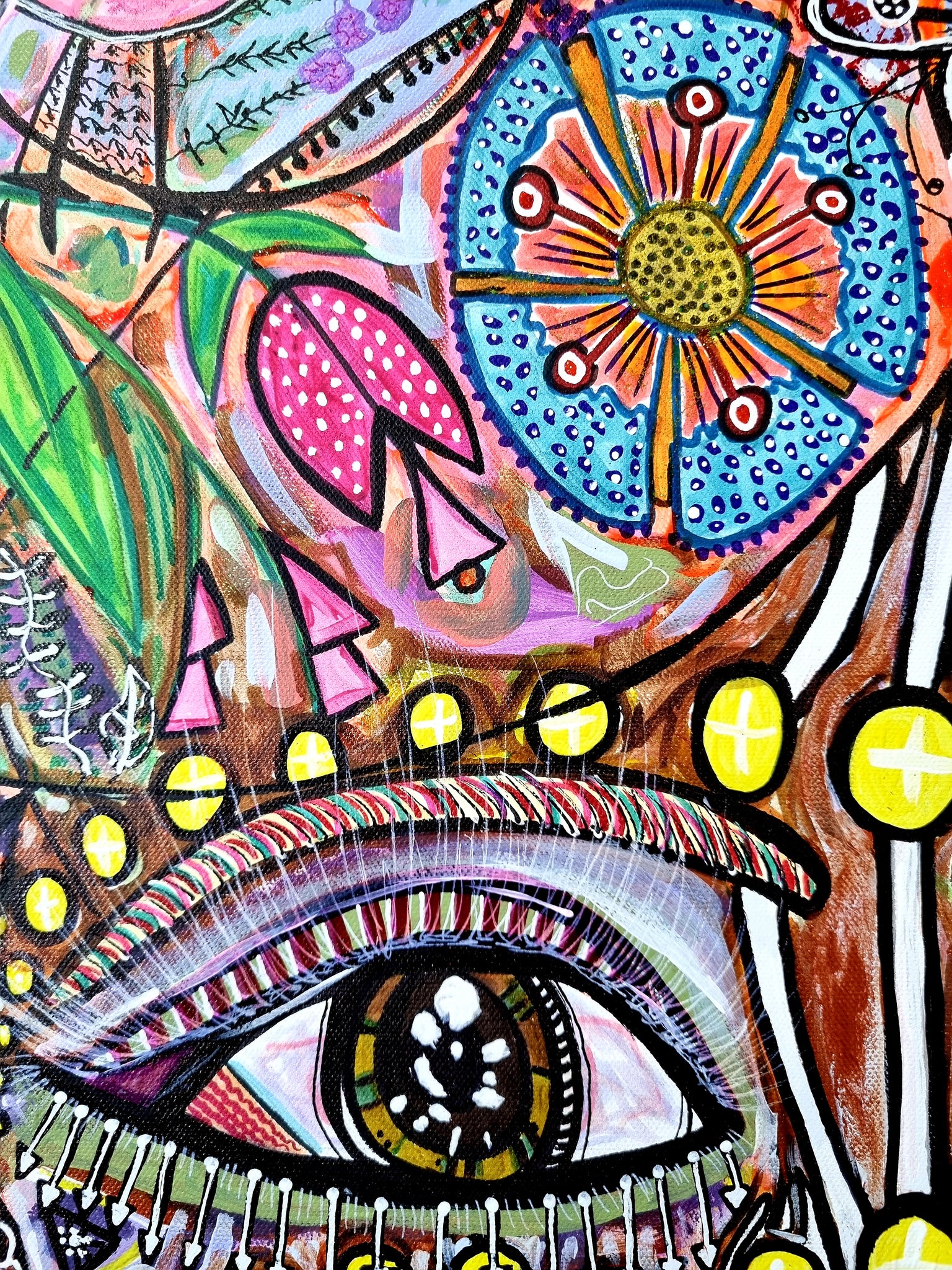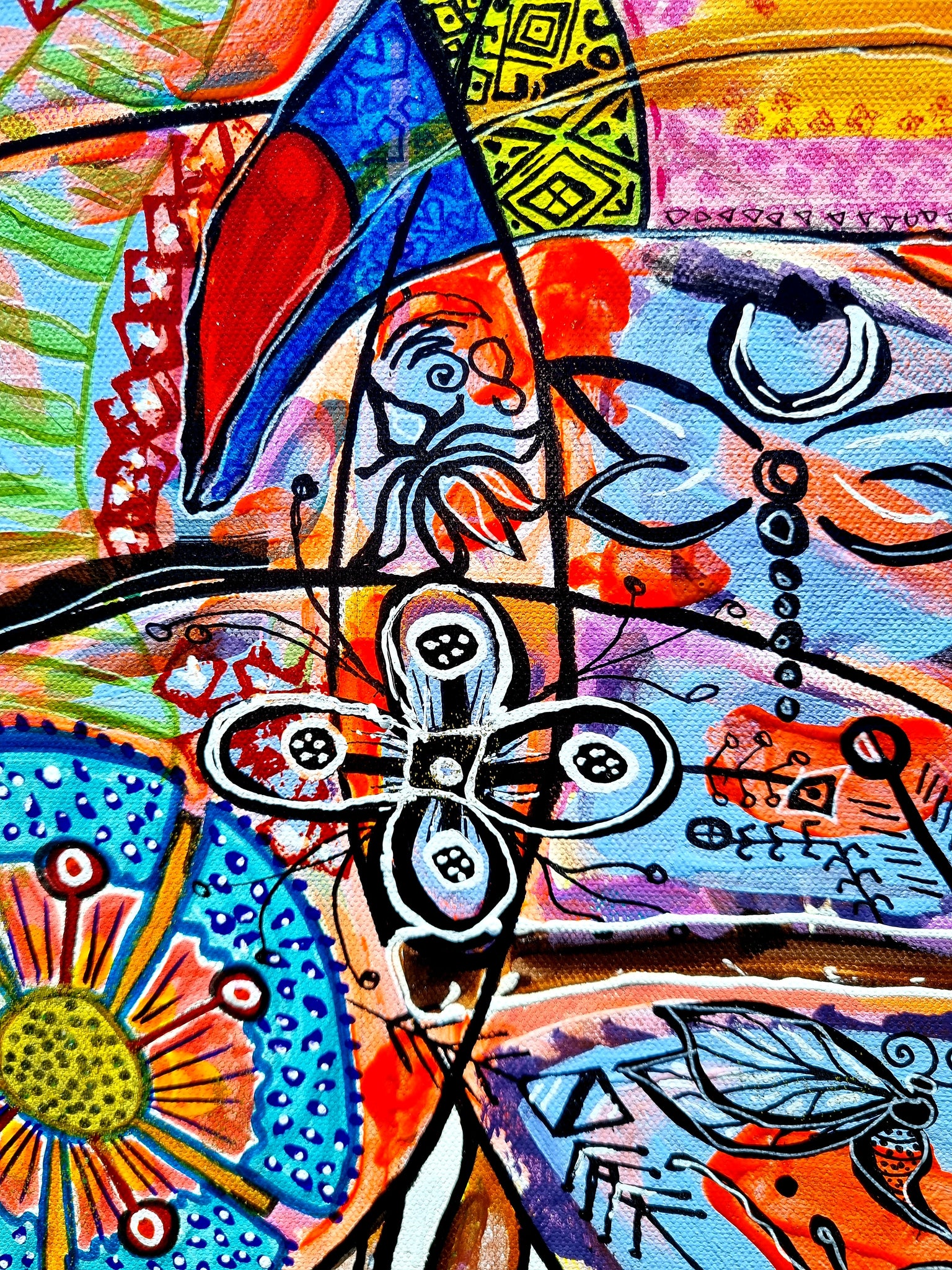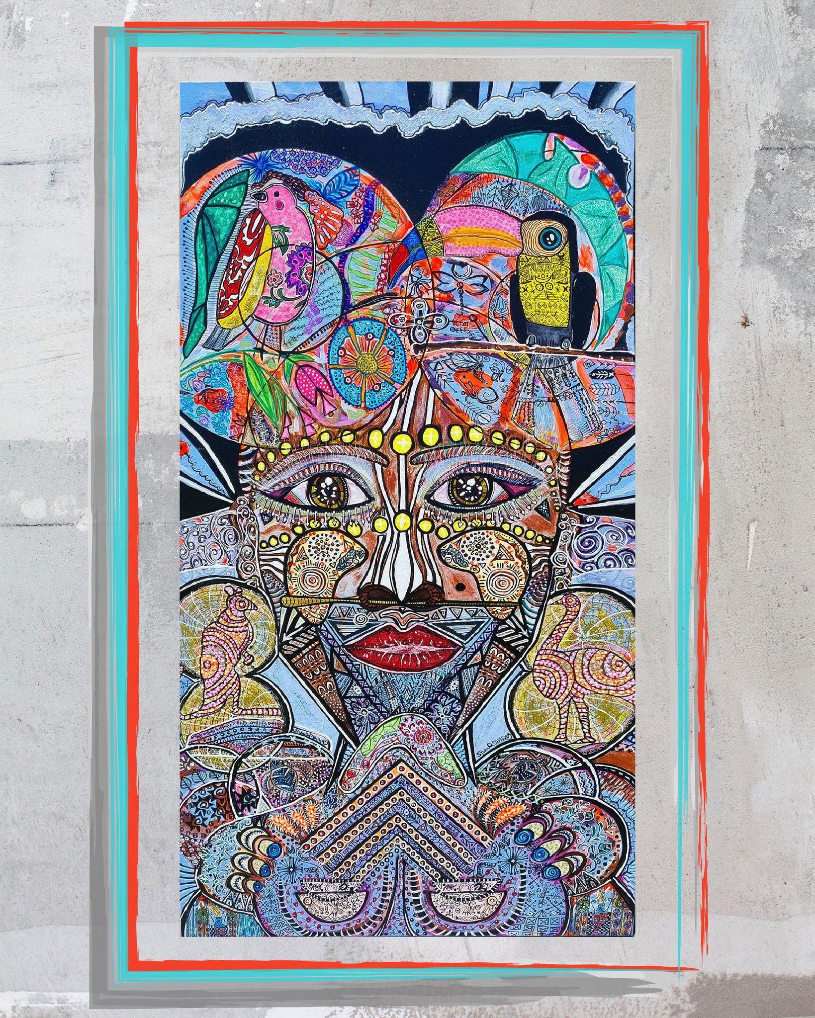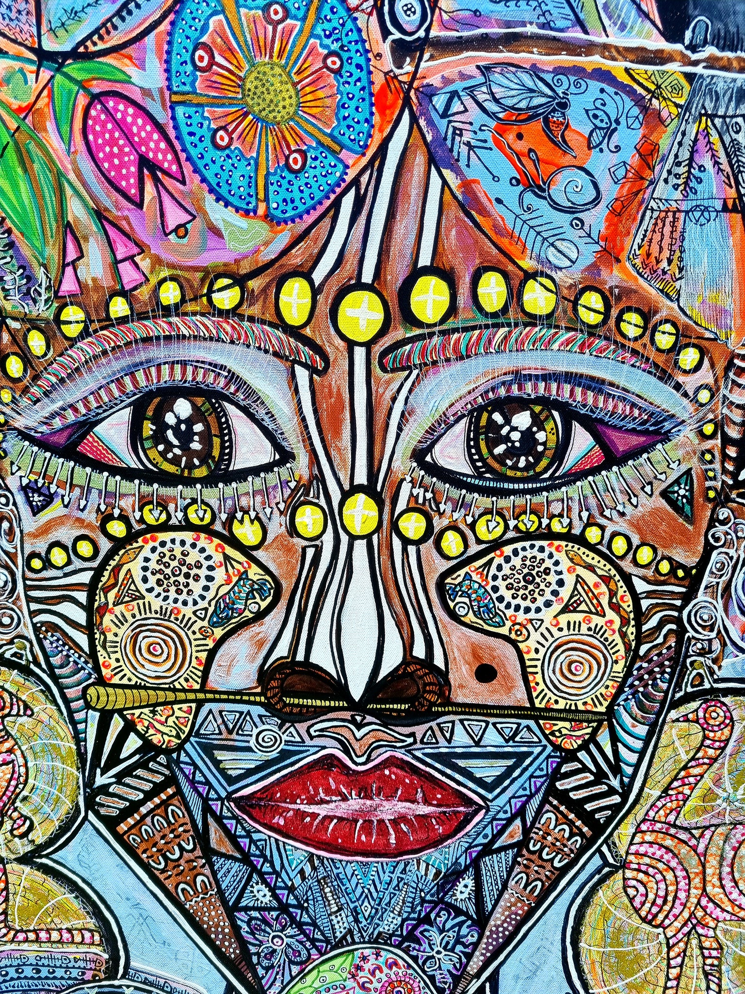 Wiana symbolises the Earth, subtly alluding to its role as a universal mother, reminding us of the interconnectedness of all life forms. She is our foundation, grounding us in the present, reminding us of our past and shaping our future. Her embrace is represented in the intertwining roots that sprawl across the canvas, and the inextricable connection we all hold to our ancestry and heritage.
