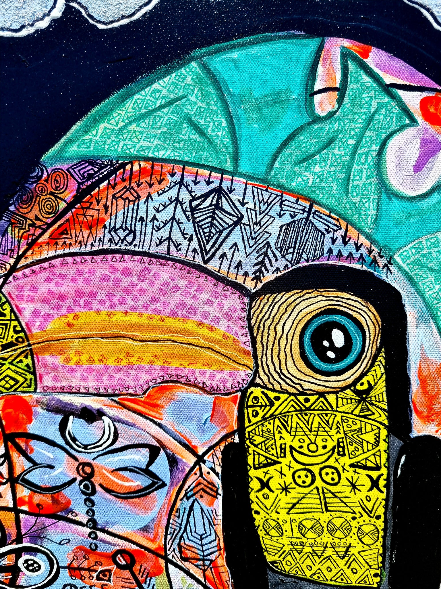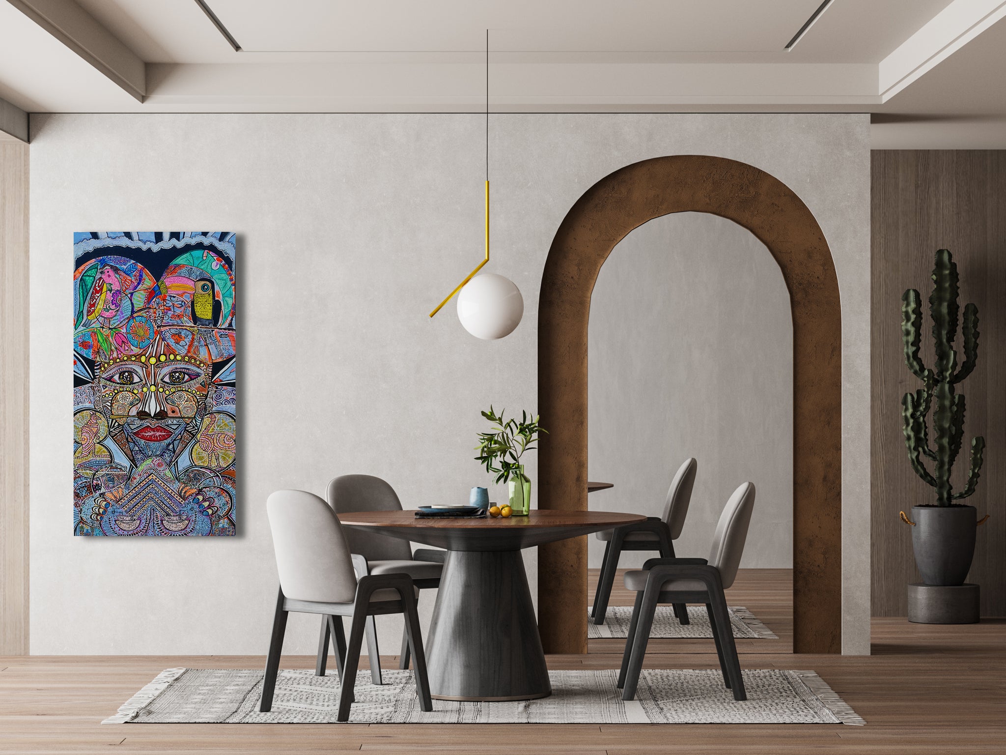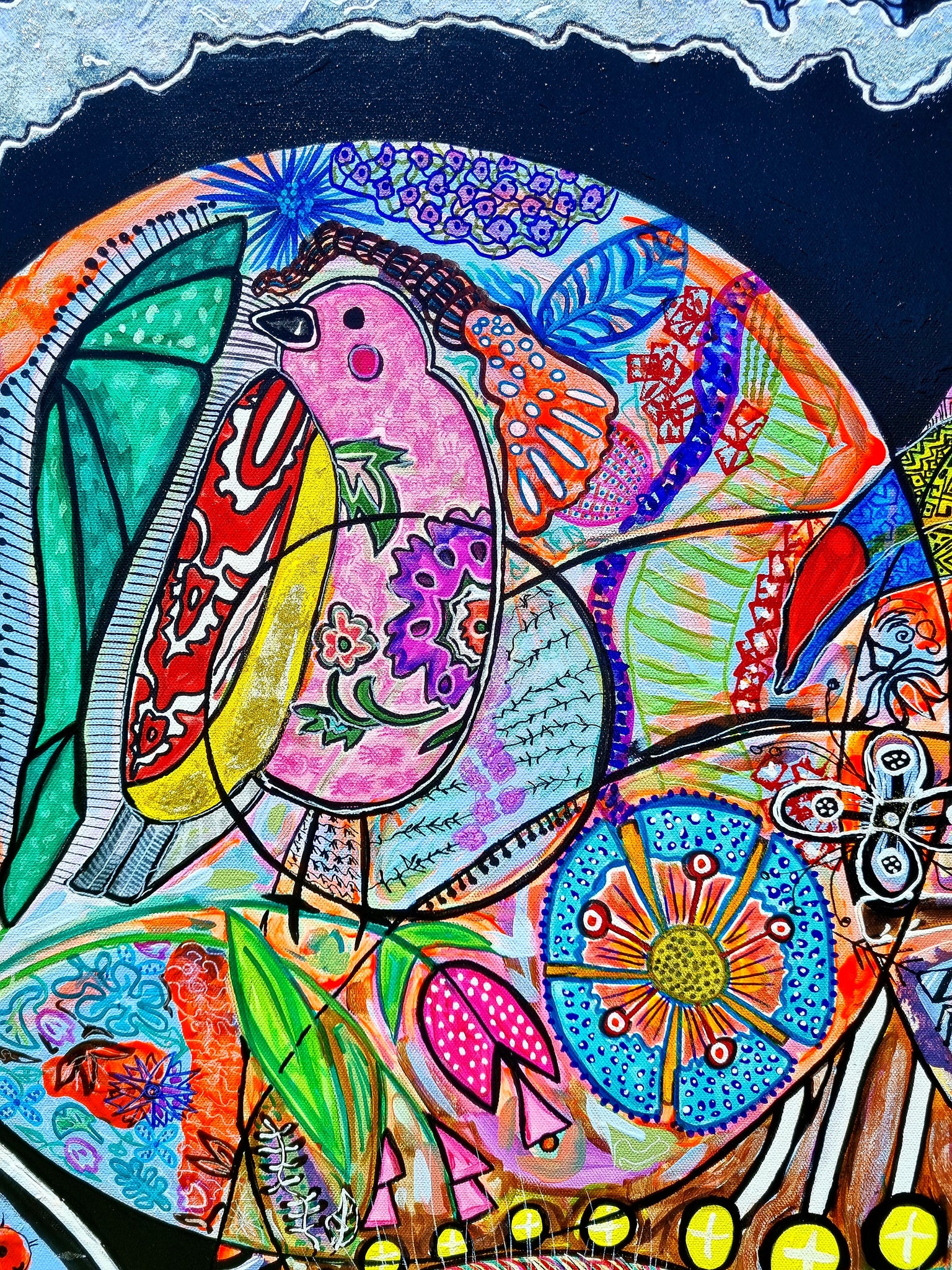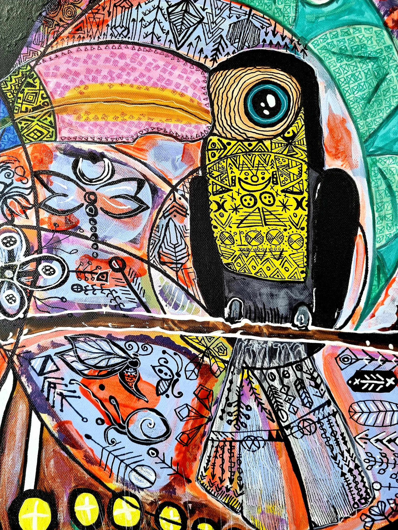 Wiana symbolises the Earth, subtly alluding to its role as a universal mother, reminding us of the interconnectedness of all life forms. She is our foundation, grounding us in the present, reminding us of our past and shaping our future. Her embrace is represented in the intertwining roots that sprawl across the canvas, and the inextricable connection we all hold to our ancestry and heritage.