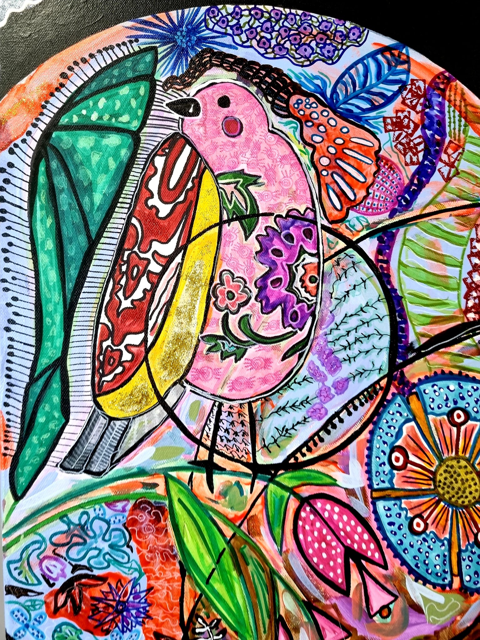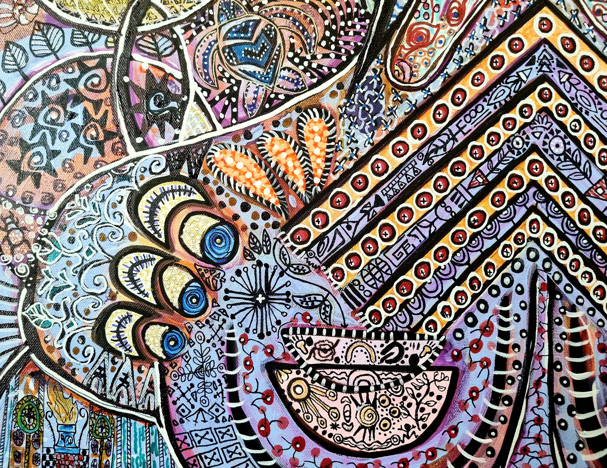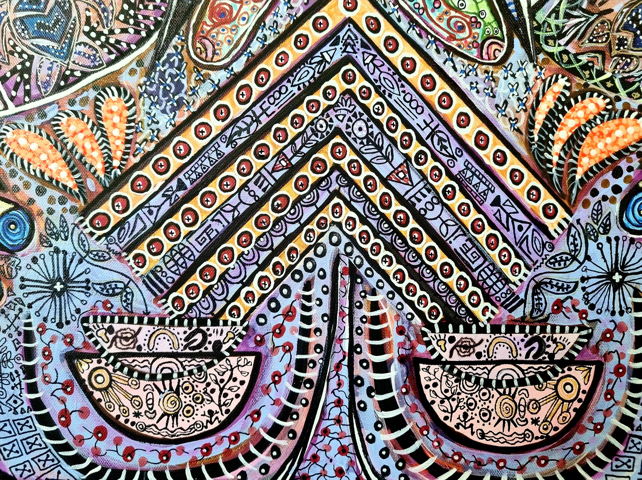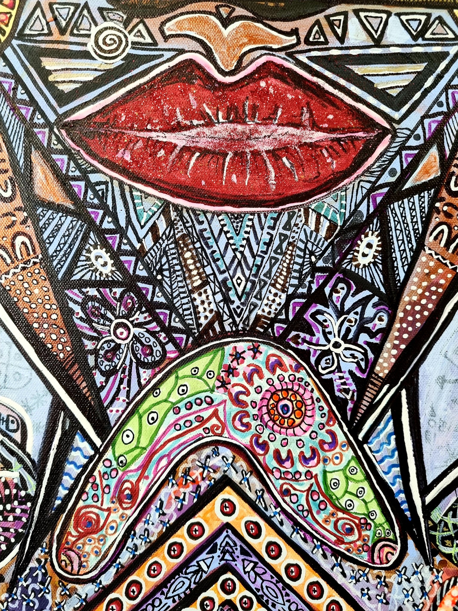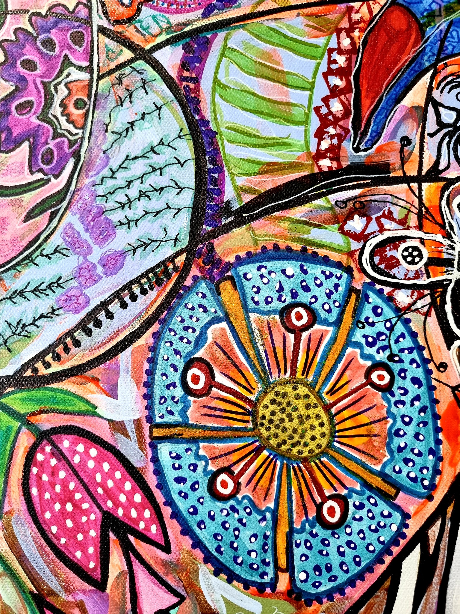 Wiana symbolises the Earth, subtly alluding to its role as a universal mother, reminding us of the interconnectedness of all life forms. She is our foundation, grounding us in the present, reminding us of our past and shaping our future. Her embrace is represented in the intertwining roots that sprawl across the canvas, and the inextricable connection we all hold to our ancestry and heritage.